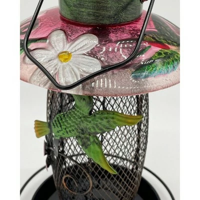These glass bird feeders are a pop of color for your garden but will always bring light to your feeder at night as its solar. Darling little flowers and critters on the wire mesh and then the glass lids have beautiful designs. Holds up to 4 cups of bird seed. The solar panel is integrated into the good.