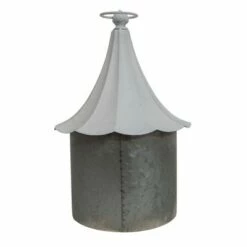 Set of two 22 and 15 inch french country inspired distressed white finish iron round hanging and standing birdcages with floral and bird design, domed tops with hangers, door openings and flat bottom bases. Perfect decor for both indoor and outdoor settings. Provides both decorative and functional purposes.