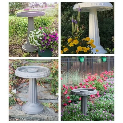 DESIGNER COLLECTION by Bloem: Welcome feathered friends into your garden with this Bloem birdbath, which brings timeless beauty to your outdoor space. Perfect for your garden or near your favorite gathering spot, it features a 17-inch diameter basin with a gradual 2″ slope depth which makes it very easy for birds to splash in and enjoy. Measures 17 inches in width by 25 inches height. Blow molded pedestal features a hallow core and water-tight base. Fill pedestal with sand for added stability year-round. Bird bath top basin attaches in seconds with three (3) all-weather screws (included).