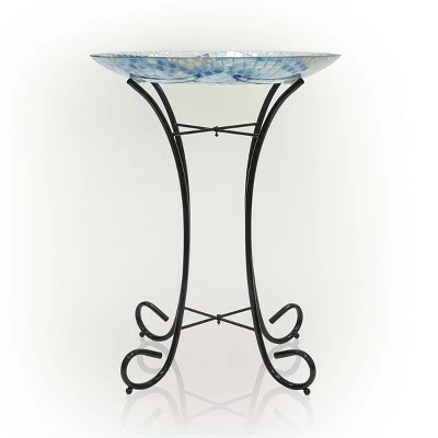 - INCLUDED STAND: Glass birdbath includes a metal stand to elevate the basin and prevent it from tipping over