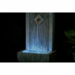 - LIGHT WEIGHT MATERIAL: Made of light weight cast resin this fountain includes pump with cord that plugs into standard wall outlet and built in LED light that will illuminate the fountain at night, measures 12”W, 11.5”L and 19.75”H