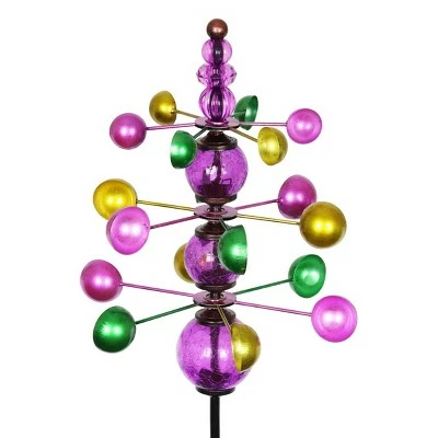 Beautiful three tiered spinning garden art adds a burst of color and life to your garden. Purple glass crackle balls add an elegant anchoring detail as the hand-painted, multicolored layers spin in the breeze. Makes a beautiful kinetic gift for the garden enthusiast.
