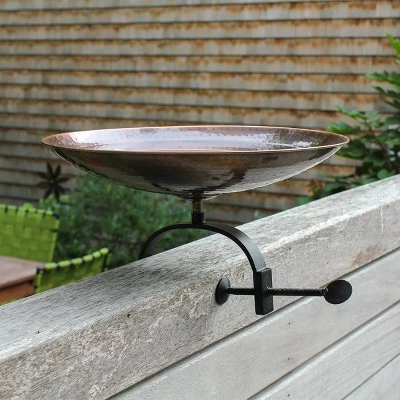 - OVER RAILING BURNT COPPER BIRDBATH: This shallow birdbath has a classic round hammered or “peened” texture and an antique copper finish that will patina naturally
