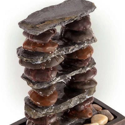 - CASCADING TABLETOP FOUNTAIN: Contemporary design with natural aged stone look and river stones