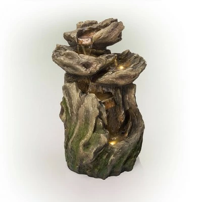 Relax to the sounds of nature with the Alpine Corporation 22″ tall Outdoor Five-Tier Rainforest Log Waterfall Fountain with LED Lights. This cascading rainforest waterfall floor fountain provides a tranquil and soothing addition to your porch, backyard, or lawn. Constructed from durable polystone and fiberglass with a natural look and realistic textures, the fountain is weatherproof, rust-resistant, and resilient. This lawn statue will bring a touch of natural beauty to your outdoor space. Replicating natural wood and stone formations, the fountain becomes illuminated with the included white LED lights. The beautifully crafted wood and stone looking fountain imitates the natural drips of a forest. Relax to the sounds of the soft, natural water flow as it trickles down from the top tier of the fountain through the tiers of logs. Not only will the fountain provide you with serenity, it will also attract birds to your outdoor area, which in turn promotes healthy gardens. This floor fountain provides an elegant addition to your courtyard, patio, or yard, and gives your garden visual interest with its natural waterfall style. For quick installation and convenient operating, the fountain includes all necessary parts, as well as a pump, to begin creating an outdoor oasis. This standing fountain measures 15″L x 12″W x 22″H and includes a one-year manufacturer’s warranty from date of purchase.