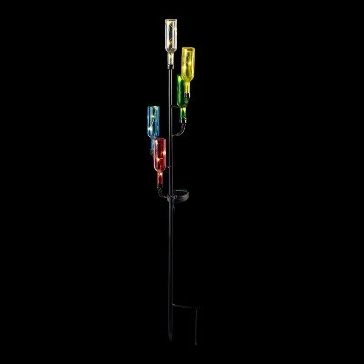Light up your evening gardens with fun and vibrant decors like this glass bottle candelabra stake. This decor features a set of colorful inverted glass bottles on a candelabra stake fashioned with solar-powered warm white LED string lights that last up to 6 hours on one full charge. It adds a great ambient feel to your outdoor evening setting in any given season. It’s perfect for pathways and as accent decors to your vibrant garden life, creating a stunning outdoor display.