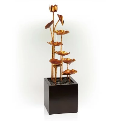 - BEAUTIFUL DESIGN: Copper-colored leaves that elegantly cascade water down to the river rocks in the modern base create a look that is stylish with any decor