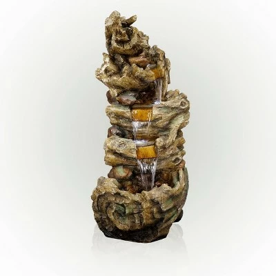 Enhance your outdoor living space with this 47″ tall Outdoor 5-Tier Tree Trunk Waterfall Floor Fountain with LED Lights from Alpine Corporation. This 5-tier cascading waterfall fountain floor statue provides a tranquil and soothing addition to your porch, backyard, or lawn. Constructed from durable polystone and fiberglass, this tall lawn statue will provide a blissful and harmonious addition to your home’s backyard. Replicating an ancient tree, the fountain becomes illuminated with the included 24 white LED lights, providing you absolute bliss and is sure to make you feel like you’re sitting beside a majestic mountain stream. Relax to the sounds of the soft, natural water flow as it cascades from the top tier of the fountain to the bottom tier. Not only will the fountain provide you with serenity, it will also attract birds to your outdoor area, which in turn promotes healthy gardens. This classic and charming floor fountain provides an elegant addition to your courtyard, patio, or yard, and gives your garden visual interest with its timeless design and natural waterfall style. For quick install and convenient operating, the waterfall fountain includes all necessary parts, as well as a pump, to begin creating an outdoor oasis. This standing fountain measures 27″L x 20″W x 47″H to fit almost any outdoor space and includes a one year manufacturer’s warranty from date of purchase.