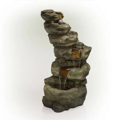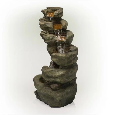 Enhance your outdoor living space with this 48″” tall Outdoor Multi-Tier Pristine Waterfall Fountain with LED Lights from Alpine Corporation. This multi-tier cascading waterfall floor statue provides a soothing addition to your porch, backyard, or lawn. Constructed from durable polystone and fiberglass with a natural stone and aged look, the fountain is weatherproof, rust-resistant, and resilient. This realistic stone lawn statue will provide a tranquil addition to your home’s backyard. Replicating stones in a babbling brook, the fountain becomes illuminated with the included 30 white LED lights, providing you a nighttime escape to the great outdoors. Relax to the sounds of the soft, natural water flow as it cascades down from the top tier of the fountain. Not only will the fountain provide you with serenity, it will also attract birds to your outdoor area, which in turn promotes healthy gardens. This classic and charming standing fountain provides an elegant addition to your courtyard, patio, or yard, and gives your garden visual interest with its timeless design and natural stone waterfall style. For quick install and convenient operating, the waterfall fountain includes all necessary parts and a pump, to begin creating an outdoor oasis. This standing fountain measures 26″”L x 21″”W x 48″”H to fit almost any outdoor space and includes a one-year manufacturer’s warranty from date of purchase.