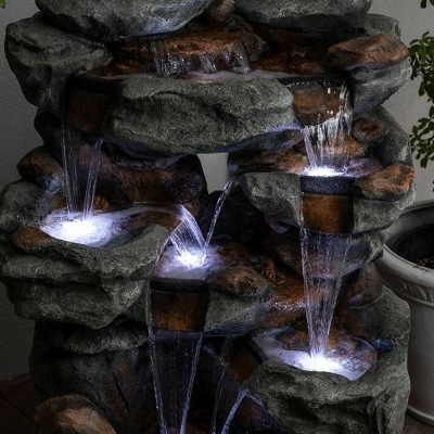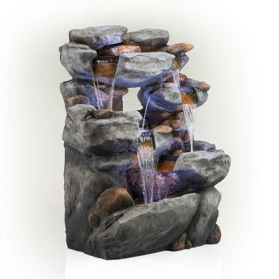 Unplug from the day and meditate to the sound of flowing water with Alpine’s 54″” tall Indoor/Outdoor Waterfall Rock Fountain with LED lights. This relaxing floor fountain statue provides a tranquil and soothing addition to your yard, porch, or patio and even inside your home. Constructed from durable polystone and fiberglass, the fountain is weatherproof, rust-resistant, and resilient for use in your home’s interior décor or outside. This unique and versatile décor piece includes LED lights for a tranquil and soothing addition to your home’s backyard or indoor décor. Replicating a rainforest scene, the fountain has a natural appearance and realistic stone textures. Relax to the sounds of the calming natural water flow as it trickles down through the rocks. For quick installation and convenient operating, the fountain includes all necessary parts, including a pump, to begin creating an outdoor oasis. This fountain measures 38″L x 27″W x 54″H to fit almost any indoor or outdoor space and includes a one-year manufacturer’s warranty from date of purchase.