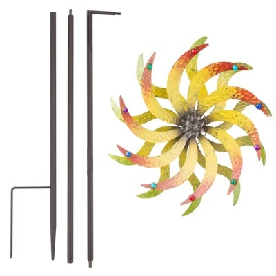 Welcome your guests with the 72″ tall Outdoor Metal Starburst Dual Windmill Spinner Stake with Gems Yard Decoration from Alpine Corporation. This multi-colored outdoor yard art is made with earth-tone colored metal blades that replicate a windmill and add a breathtaking display of spinning movement and motion. Sparkly gems have been added to the blades to add more light-reflecting color when the spinner moves. Skillfully crafted from weather-resistant and sturdy metal, the all-season decorative spinner can be cleaned easily to keep its reflective shine and beautiful colors. Add one or multiple spinners to enhance your garden’s natural beauty with their gorgeous electrifying colors and eye-catching movements. Add an attractive outdoor display by lining several spinners along your driveway or front walkway. All parts are included for a quick install and convenient outdoor decorating. The outdoor spinner includes an attached ground stake to secure along pathways or in your flowerbeds. This extra tall wind spinner measures 16″L x 6″W x 72″H with the included ground stake, and includes a one-year manufacturer’s warranty from date of purchase.