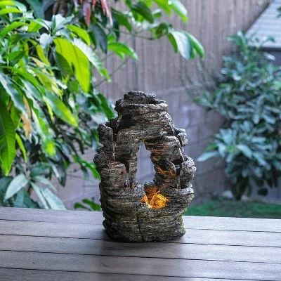 - DURABLE LAWN STATUE: Constructed from durable polyresin, stone powder, and fiberglass materials with a natural stone look, the waterfall fountain is weatherproof, rust-resistant, and resilient