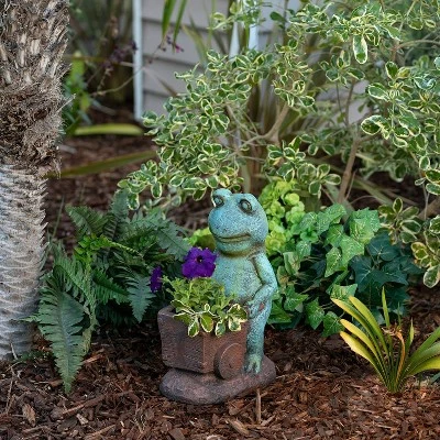 - GARDEN STATUE: Lawn figurine features a frog pushing a wagon for a fun addition to your home’s outdoor area