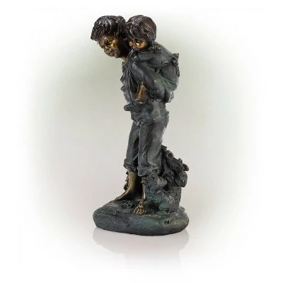 Re-live your carefree childhood days with this 16″ Tall Indoor/Outdoor Patina Finish Piggyback Ride Yard Statue from Alpine. This adorable antique and vintage style bronze statue with Patina finish featuring a young boy giving a little girl a piggyback ride will take you back in time to a bygone era, and captures the innocence of childhood. This 16” tall statue is constructed from durable magnesium oxide with a bronze patina finish. The yard art decoration is made for outdoor use, and is weatherproof and rust-resistant for years of quality use on your lawn or patio. It can also be used in your home to add a timeless relic to commemorate the days of yore. With the intricate and life-like details, this versatile metal outdoor sculpture is ideal for memorial gardens or as a special keepsake in your living room or family room to remember someone special. Add one or multiple statues to enhance your garden’s natural beauty, and it complements a variety of other Alpine outdoor statues. It’s also perfect for display on your deck, porch, outdoor tabletop, or as accent décor piece on a console table. This compact outdoor statue measures 8″L x 6″W x 16″H, and includes a one year manufacturer’s warranty from date of purchase. Alpine Corporation is one of America’s leading designers, importers, and distributors of superior quality home and garden decor products. Alpine’s award winning in-house design team continuously develops new and innovative “statements pieces” for your home and garden. Your outdoor living spaces will be the envy of the neighborhood with our wide assortment of fresh, fashionable and contemporary products, from beautifully crafted solar garden stakes featuring patented motion and fiber optic lighting technology to gorgeous glass and glow-in-the-dark bird baths and feeders.