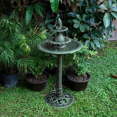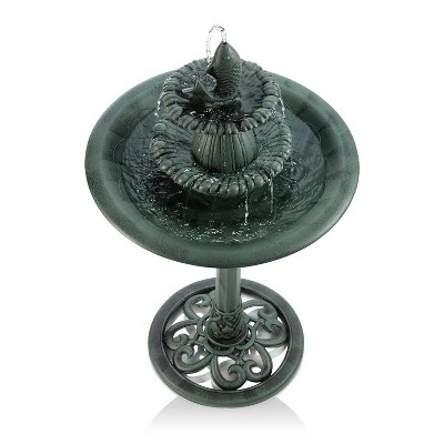 Beckon feathered friends to your yard with the Alpine Corporation Tiered Pedestal Fish Fountain Birdbath. Fill the bath with fresh, shallow water and enjoy watching all the birds congregate near your patio, garden, deck, yard, or pool! This high-quality birdbath features a stunning teal hue with an antique finish and fish detail — great for adding a pop of color to your outdoor decor. It is perfect for pairing with a bird feeder to coax a variety of birds outside your window during any season. The soothing water flow across the three tiers will help you relax and enjoy the outdoors on a nice summer day. The sturdy pedestal keeps the birdbath from tipping over while the resin construction withstands weather changes. Your yard will be the delight of humans and winged creatures alike! With a 1-year warranty, you can be confident in the quality of your purchase. Fountain measures 20″L x 20″W x 40″H for use in yards of any size. Alpine Corporation is one of America’s leading designers, importers, and distributors of superior quality home and garden décor products. Alpine’s award winning in-house design team continuously develops new and innovative “statements pieces” for your home and garden. Your outdoor living spaces will be the envy of the neighborhood with our wide assortment of fresh, fashionable and contemporary products, from beautifully crafted solar garden stakes featuring patented motion and fiber optic lighting technology to gorgeous glass and glow-in-the-dark birdbaths and feeders.