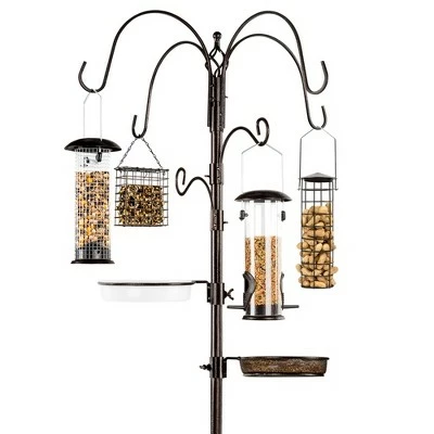 Birds of a feather flock around this multi-hook feeder! Each hook is ready for use with one of four feeder types: a wire feeder, a suet feeder, a tube feeder, and a peanut feeder. There are also a food tray and a water bowl so smaller birds can join the fun. 4 top hooks, 2 moveable hooks, a rust-resistant pole, and a 5-prong base make this a sturdy, dynamic garden fixture. The base secures deep within the ground for a sturdy hold. Feeding accessories are included! (Bird food not included)