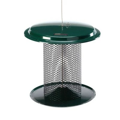 Magnet mesh sunflower feeder. All-steel construction and polyester powder coated. Center seed diverter, drainage holes in base, easy to fill and clean. Dispense sunflower, peanuts or a blend of seed. Comes with a lifetime guarantee. Available in green top and bottom with black screen. It holds 5-quarts. Measures 12-1/2-inch width by 12-inch height with hanging cable of 19-1/2-inch height.