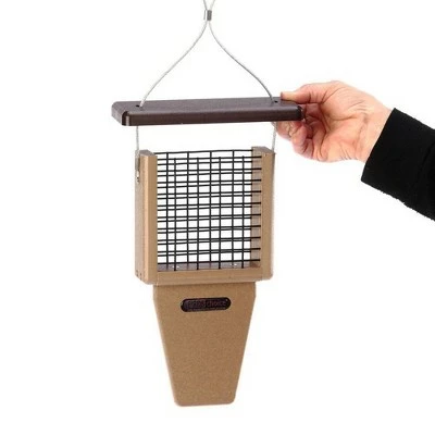 - PRODUCT DETAILS: The Birds Choice Single Cake Tail Prop Suet holds 1 suet cake Measures 8″L x 3″W x 12″H and 19-1/2”H with hanging cable Hanging cable included Made from Poly-lumber with brown roof and taupe base