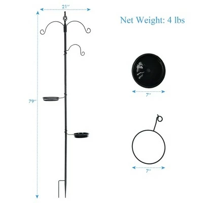 Start to enjoy hours of bird watching! . Turn your yard into a bird lovers’ paradise with this bird feeding station kit! With the height of 79”, the feeding station is naturally to attract the most beautiful birds and offer a vibrant scene. You just need to insert it in yard or garden and enjoy hours of birding entertainment. Feeding beautiful birds and listening to them singing are certain to bring you endless fun. Made of sturdy iron material, the bird feeding station kit is amazingly durable and stable. More importantly, the bird feeding station kit features completed accessories. Both watering and bathing solution are available for birds. The mesh tray and bird bath are also adjustable. . Specification: Color: Black. Material: Iron . Product Dimensions: 79” x 21” inch (W x H) . Mesh Tray Diameter: 7”. Bird Bath Diameter: 7”. Net Weight: 4 lbs. Package includes: . 1 x Bird Feeding Station Kit. 1 x User Guide.