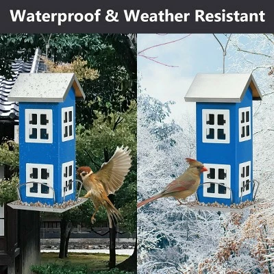 Our bird feeders can help you better feed and observe various birds. This cute feeder is a house shape, which will surely attract many birds to your backyard and make your backyard a meeting place for the birds! Unfixed roof not only allows you to fill a variety of seeds, but also allows you to better clean the inside of the bird feeder. The transparent window allows you to monitor the amount of food at any time. The unique design allows the seeds to be evenly distributed into the seed tray and stops dispensing after the tray is full, making it ideal for our furry friends. The bird platform that can be opened allows them to park on it for better eating. This is a perfect gift for your love ones! Specification: Color: Blue/Green/Red. Material: Iron Sheet, PC Sheet. Capacity: 0.5 us gal. Overall Dimension: 5”L x 5”W x 10.5”H. Product Weight: 1lbs. Package includes:. 1 x Bird Feeder.