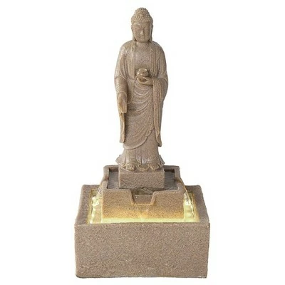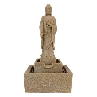 Our Earth Witness Buddha is depicted with his left hand cupped indicating he has achieved enlightenment. Floating above a radiating LED illuminated double pedestal basin, our Buddha sculpture will become the centerpiece of any Zen garden and creates a peaceful atmosphere. Tranquil cascading streams of water flow to create a meditative retreat. The Earth Witness Buddha Fountain is perfectly sized to be placed anywhere, from a deck to an Asian garden and the fountain boasts an illuminated LED pool to be admired day or night. Cast in quality designer resin and hand-finished to replicate natural sculpted sandstone, our Earth Witness garden fountain features a UL-listed, indoor/outdoor pump that allows you to enjoy the lyrical sound of falling water. Another meditative sculptural fountain from Design Toscano that will make a delightful gift for yourself or a friend! Some assembly required
