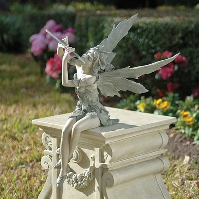 Delight the senses with our romantic fairy figurine that charms with her joyful flute and graceful pixie wings! Our fairy statue is ready to celebrate in home or garden oasis while perching atop window ledge, garden wall or library shelf. Artist Cecilia has delicately sculpted our Design Toscano exclusive fairy statue, and then cast it in quality designer resin with a lovely two-tone fairy finish.