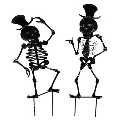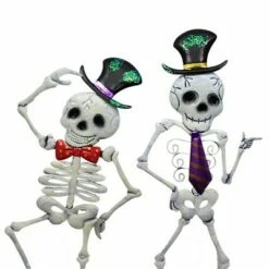 These Bony Skeletons Are Dressed For Their Yearly Halloween Party! One Wears A Black Top Hat With A Purple Band Along With A Red Bow Tie With Gold Polka Dots. The Other Also Wears A Black Top Hat But It Contains A Gold Band Along Plus A Long Purple Tie With Gold Diagonal Stripes.. New.. Measurements 18.75 In H X 7.0 In W X .12 In D. . Made Of Metal. No Assembly Required. Indoor Or Outdoor Use. Imported. NOTE: When Received, Product May Require Slight Reshaping Or Fluffing Due To Transportation. We Recommend That All Products (Metal, Fabric, Wood, Cement, Polyresin) Placed Outdoors Be Sprayed Each Year With A Non-Yellowing, Clear Coat Garden Decor Protection Spray Found At Your Local Craft Store To Preserve Their Original Appearance And To Extend The Life Of Your Product.