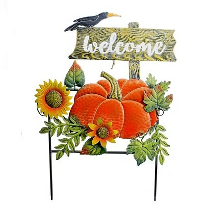 A Black Crow Is Perched On Top Of The Wooden Sign Behind A Orange Pumpkin And Sunflowers To “Welcome” All Who Enter The Pumpkin Field.. New.. Measurements 28.5 In H X 20.0 In W X .5 In D. . Made Of Metal. No Assembly Required. Indoor Or Outdoor Use. Imported