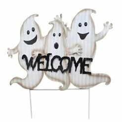 Three Ghost To Welcome Visitors To Your Home. They Have Their Arms Up And Waving With Smiling And Scared Faces! In Front Of Them Is A “Welcome” Sing Made Of Black Creepy Metal Letters.. New.. Measurements 36.5 In H X 37.0 In W X 1.0 In D. . Made Of Metal. No Assembly Required. Indoor Or Outdoor Use. Imported. NOTE: When Received, Product May Require Slight Reshaping Or Fluffing Due To Transportation. We Recommend That All Products (Metal, Fabric, Wood, Cement, Polyresin) Placed Outdoors Be Sprayed Each Year With A Non-Yellowing, Clear Coat Garden Decor Protection Spray Found At Your Local Craft Store To Preserve Their Original Appearance And To Extend The Life Of Your Product.