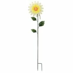 A 52.00 Inch Tall Visual Height Pale Yellow With A Bright Golden Center Daisy Yard Stake.. New. Measurements 59.00 In H X 13.00 In W X 1.00 In D. . Made Of Metal. Assembly Required, Tools Provided. Indoor Or Outdoor Use. Imported