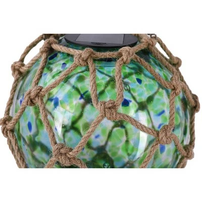 Decorate your garden during the day and color it at night with this Solar Art Glass Fishing Float. This design is inspired by fishing floats used by commercial fishing companies in Asia dating back to 1950. Its vintage look features a glass ball wrapped in rope with a green and blue speckled design that glows in the night after absorbing sunlight during the day. This piece is made of durable high-quality glass, fiber, and durable plastic, making it outdoor-safe and weather-resistant. The design can be displayed indoors or outdoors, but place the fishing float in direct sunlight for best results. The solar-powered design requires 6-8 hours in direct sunlight for a full charge to illuminate throughout the night. Requires 1x AA Ni-MH battery, which is included. The hanging height is approximately 16 inches.