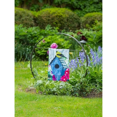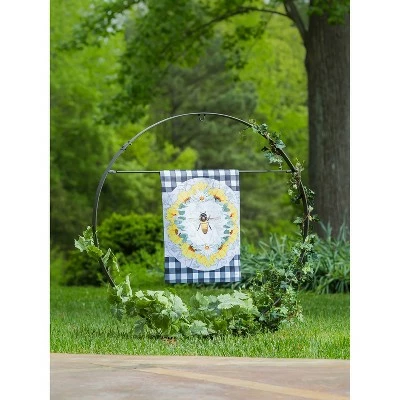 Add extra pizzazz to the display of garden flags or hanging planters with this unique round sculptural decor. Crafted from durable iron, this design forms a perfect circle with plenty of options for easy hanging of your decor. Spruce up your outdoor space even more with crawling vines that grow around this hardware. The removable bar is ideal for hanging flags, while the loop at the top is perfect for hanging planters, chimes, bells, and more. The pronged base offers a sturdy foundation for this sculptural display, so you don’t have to worry about wind or weather. The unique shape creates a focal point for your garden while showing off your decor!
