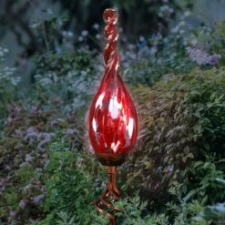 Add a touch of color and light to your garden with an elegant solar glass flame garden stake in red. A solar-powered LED will automatically illuminate the glass every evening adding a beautiful glow to your garden. A perfect addition to your landscape! Exhart hand-blown glass pieces are one-of-a-kind and present with slight color variations.