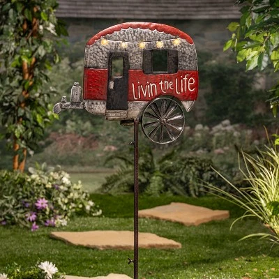- This charming yard stake is artfully-designed as an antique camper with brightly colored red body and rustic silver accents, with “Living the Life” written on the side