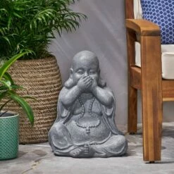 Pair your outdoor space with an aesthetic accessory that is beautifully designed with peace and serenity in mind. Carefully crafted from cast stone, our garden statue features a charismatic monk design that is covering his mouth so he will speak no evil. This statue offers a durable structure and weather-resistant properties making this a perfect addition to your backyard or patio space. Finished with a neutral wash, this exquisite garden accessory will easily bring your decor to the next level.
