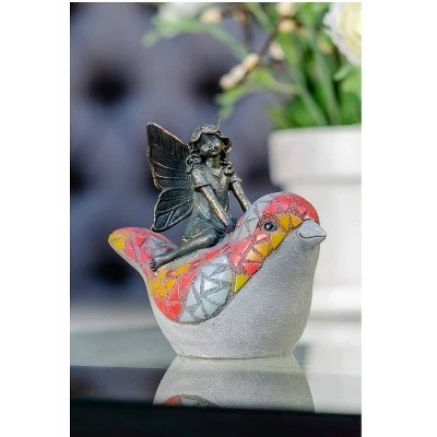 - FAIRY STATUE WITH LED LIT MOSAIC BIRD: Decorate your home or garden and give it a peaceful touch with this statue of a fairy sitting atop a mosaic bird and enjoy the colorful glow it gives