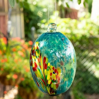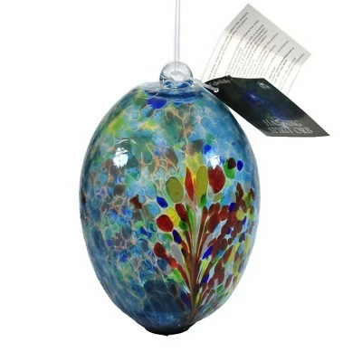Hanging Glass Translucent Orb Made Of Hand Blown Art With A Main Color Of Blue And Splashes Of Red, Green, Yellow, White And A Darker Blue.. New. Comes Packaged In A Box.. Measurements 7.5 In H X 4.5 In W X 4.5 In D. . Made Of Glass. No Assembly Required. Indoor Or Outdoor Use. Imported