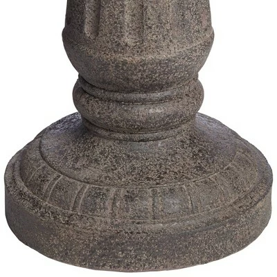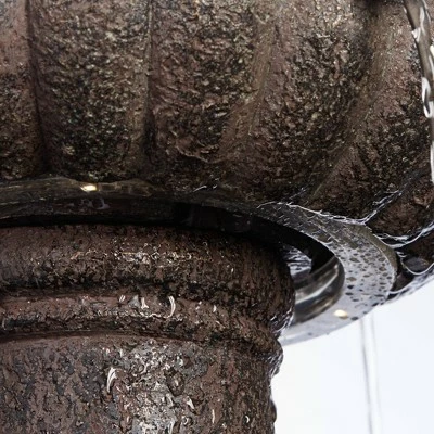 A romantic Euro-style design embellishes the charming beauty of this gray stone finish three-tier outdoor floor water fountain. Bonus lighting increases its mood-altering effects after dark, blending with the soothing sounds of cascading water. Metalized accents attract light and add beauty. Holding five to six gallons of water, its energy-efficient LED light modules deliver an output of 120 volts.