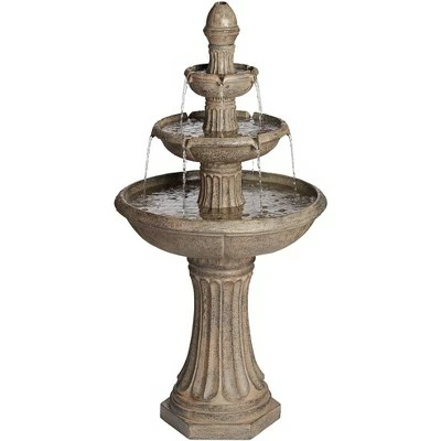 Soothing, tranquil sounds and sights come from this three-tier LED lighted outdoor floor water fountain. A gray stone finish offers natural ambiance to this detail-rich, romantic fountain featuring energy-efficient LED lighting for nighttime mood effects. Holding five to six gallons of water, its light modules deliver an output of 120 volts.