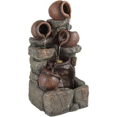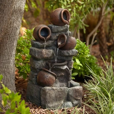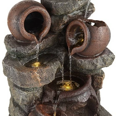 Rich tones embody an exotic look perfect for adding a dramatic look to both outdoor gardens and interior garden-like spaces. This LED cascading floor water fountain delivers rustic ambiance with a pottery and natural rock theme in a multi-tone finish over lightweight resin construction. Energy-efficient lighting adds tranquil, mood-lifting features to a fountain with calm flowing water.