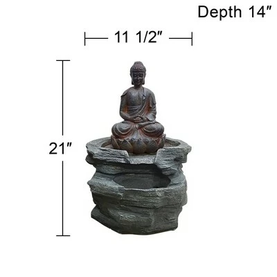 A peaceful Buddha figure meditates surrounded by water in this fountain arrangement. The faux stone platform supports the small faux carved stone statue. LEDs light up the falls from below, bringing an ethereal glow to this peaceful, meditative fountain.