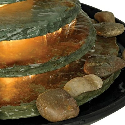Make your living spaces come alive with this soothing lighted tabletop water fountain. Water falls from level to level, spilling onto pebbles below. A Zen fountain design for a sense of calm and serenity.