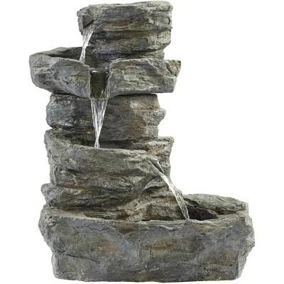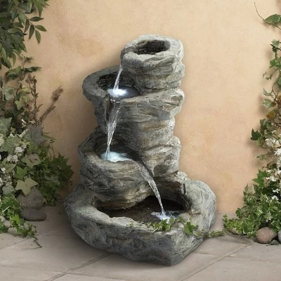 Four tiered pools look like a mountain spring waterfall in this realistic faux stone low-voltage outdoor fountain. The rocky graystone finish has gentle green and brown washed highlights, as if waters have cascaded down its surface for centuries. The three lower pools are accented with LED lights for a great look at night.