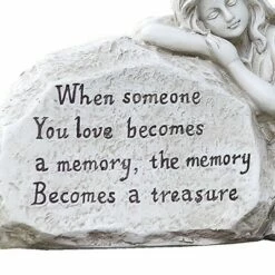 Give your garden a beautiful memorial piece with the Resin Memorial Plaque with Quote and Sleeping Angel Garden Statue by Napco. This angel plaque adds peaceful charm to your indoor space or outdoor garden.Designed with a weathered concrete finish and intricate sculpted detail, this ivory-colored statue features a beautiful sleeping angel girl resting on a stone that reads, “When someone You love becomes a memory, the memory becomes a treasure”. The weathered finish gives the statue a vintage feel that adds a beautiful look to any space. Made from durable resin, this statue won’t break or chip easily, even when displayed outside.At 6.75-inches tall, this statue is ideal for displaying in your patio, garden, or nestled in a flower bed. This decorative figurine also makes for a great gift that everyone will love. The statue is contained in protective packaging, ensuring your statues get to you in one piece.Make your outdoor garden a serene and peaceful space with the Napco Resin Memorial Plaque with Quote and Sleeping Angel Garden Statue.