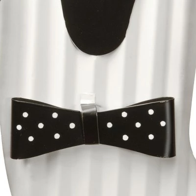 Handcrafted from metal and steel components and painted in white with contrasting black mouth and eyes, this Halloween decoration is a spooky addition to garden, porch or patio. A black bow tie with white polka dots adds a fun element to this startling spirit. Wire frame base provides ground stake for easy display.