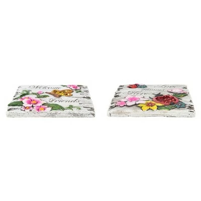 This set of garden stones is not only beautiful, but offer sweet sentiments, “Love Blooms Here” and “Welcome Friends” They can’t be any more perfect for a flower garden. Made of durable resin, these stones will last from season to season.Love blooms here and welcome friends garden stonesFloral and bee and butterfly motif Made from durable weather resistant materialHas the look of real stoneDimensions: 7″H x 7″W x .5″DMaterial(s): polystone