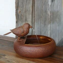 A charming addition to any patio or garden, this folk art inspired little bird fountain features an aged, rusted metal finish. Submersible pump included with adjustable water flow. Splash screen included.