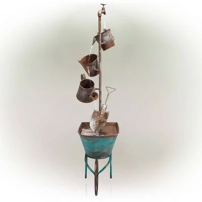 - WHEELBARROW AND WATERING CAN FOUNTAIN: This rustic multi-tier wheelbarrow and watering can fountain is the perfect addition to your outdoor décor with its 13L water capacity and an interior pump that keeps the water flowing continuously by just plugging it in