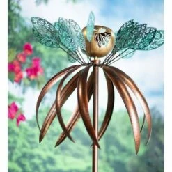 Wind & Weather Patina Leaves and Bronze-Colored Swirls Metal Wind Spinner with Golden Laser-Cut Leaf