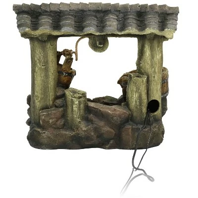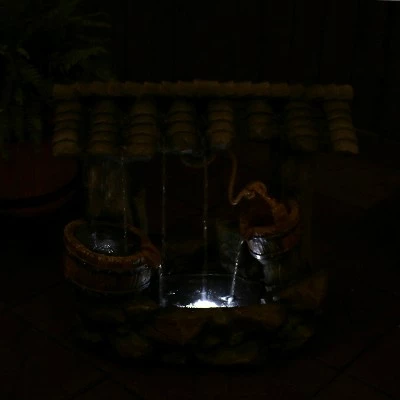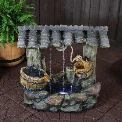 Turn any outdoor landscape into a charming oasis with this lighted outdoor wishing well fountain. Featuring bright LED lights, this outdoor water feature is sure to be the centerpiece of any front yard or patio. Water streams from underneath the roof into the buckets and well below. The fountain is durably constructed of lightweight polyresin that beautifully replicates the color and texture of natural wood and stone. Plus, it is easy to set up with no complicated plumbing or prep work required. The fountain includes an electric submersible pump that continuously recirculates the water. Images include product in nighttime environment.